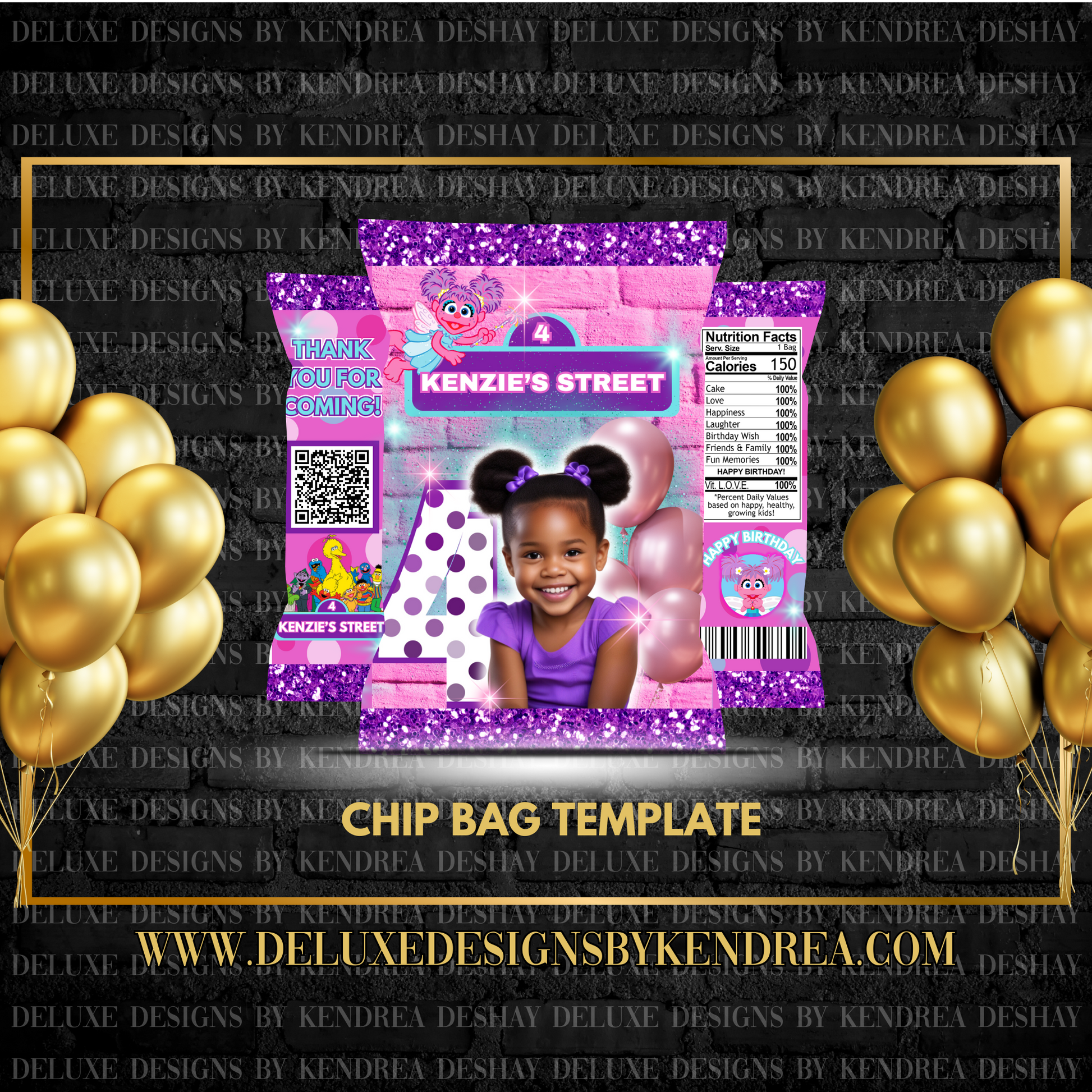 Create unforgettable party favors with our Editable Chip Bag Template, exclusively from Deluxe Designs by Kendrea DeShay. This customizable chip bag template is part of our vibrant "Sesame Street" inspired theme party favor bundle. Featuring a playful pink brick wall, the birthday girl’s name and age, and a delightful mix of pink, purple, white, and teal with polka dots and glitter accents, this template is perfect for adding a personal touch to your party treats.