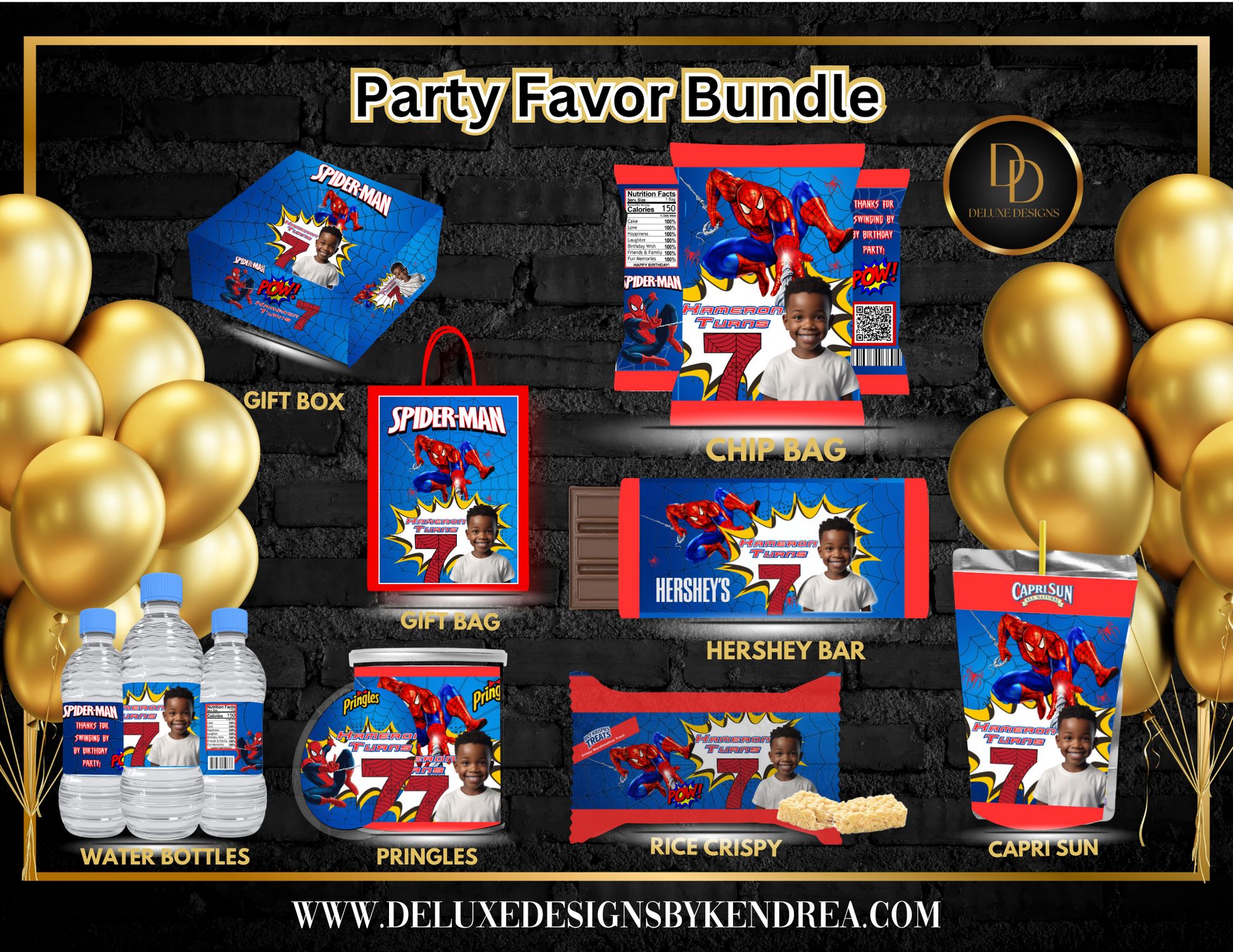 Make your child's Spiderman-themed party unforgettable with our Personalized Spiderman Party Favor Template Bundle from Deluxe DeSigns by Kendrea DeShay! This editable digital design kit includes everything you need to create custom treats that will delight your guests. The bundle features editable templates for a party favor box, party favor bag, water bottle, Capri Sun, chip bag, Hershey bar, Rice Krispy treat, and Pringles can. The design is inspired by the iconic Spiderman superhero, featuring vibrant red and blue colors, webs, and spiders. Simply change the colors, age, child's picture, and design to match your party theme.